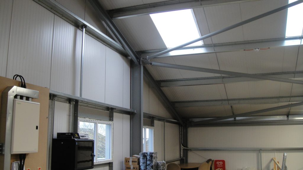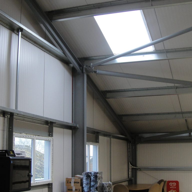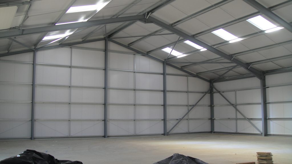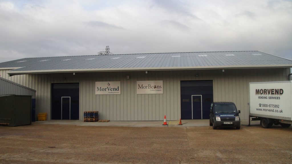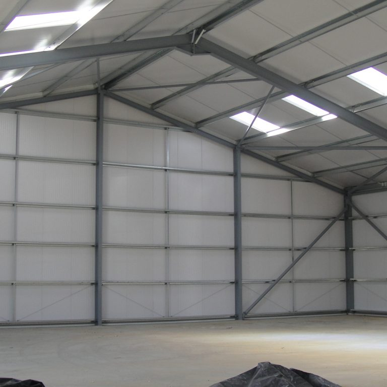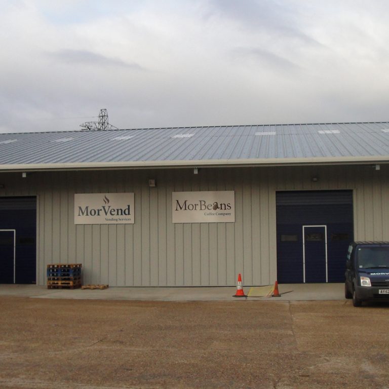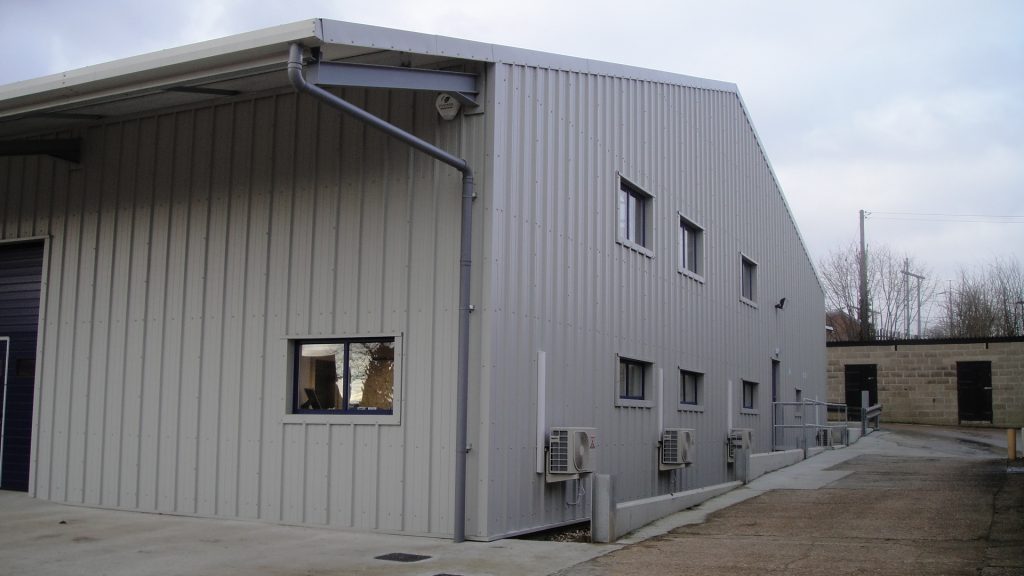 A local vending company had expanded and required larger facilities to operate from. They were located elsewhere on the site in a position where there was no room for further expansion. The offices were relocated to an existing office building on the site which left the requirement for storage and workshop spaces. A redundant farm building set on a sloping site adjacent to the offices was demolished to make way for the new warehouse. The new building was larger than that which it replaced so the building was set into the sloping ground to keep the roof height in keeping with the surrounding buildings. To avoid tanking the section of the building below ground level and avoid any risk of moisture within the storage area, a retaining wall was first built around the site to allow the new warehouse to be of conventional construction. The building is constructed from a frame steel frame with insulated cladding on both the roof and walls, although the warehouse is not heated, the decision to use insulated cladding was to avoid any risk of condensation. In addition to the main storage area there are a number of workshops and welfare facilities at one end built from insulated concrete block work. The completed building provides 615 m2 of warehouse storage and 78 m2 of workshop accommodation together with when welfare facilities for those working within the building. The project was completed in December 2012