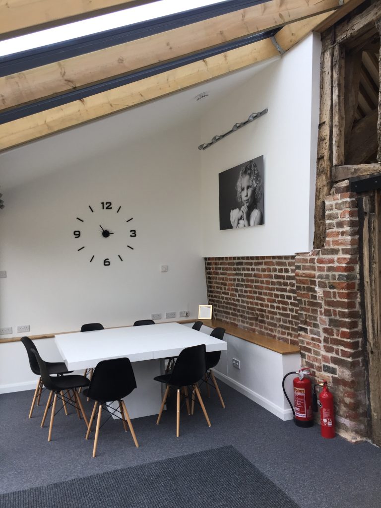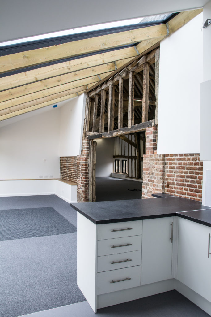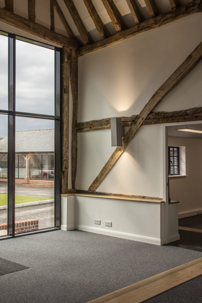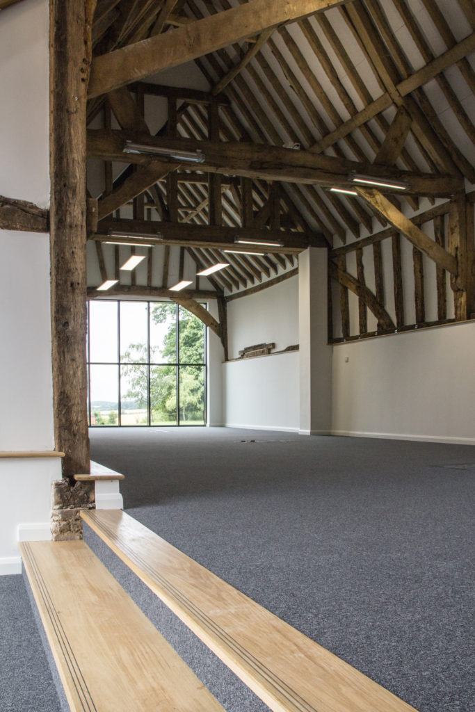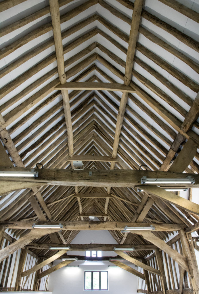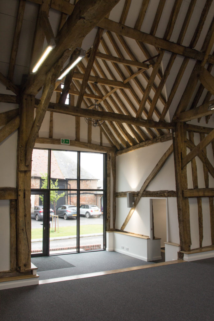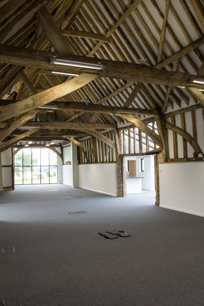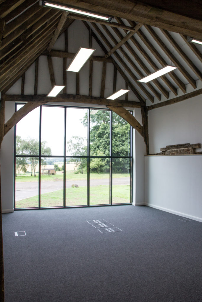 The barn was completely re-roofed with large sections of asbestos sheet roofing replaced with slate. To retain the original barn openings large glass screens were incorporated, letting light into the workspaces and also retaining the external aesthetic of the barn. Existing lean to-s were in a poor state of repair and these were either demolished and rebuilt or repaired  These now house new meeting rooms and the service areas, including the staff break out areas, kitchenette and WCs.  The rear  service wing lean to  has a zinc roof and large roof light to add a contemporary agricultural twist to the overall design.  A benefit of the lean-to housing these space is that it has allowed the main barn to be kept as a single open plan space, retaining the proportions of the original. Both the walls and roof have been insulated externally which has allowed the timber frame to be preserved internally creating a stunning interior, for which a bespoke lighting design has been produced.