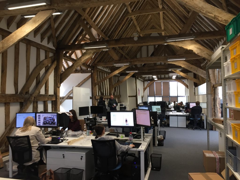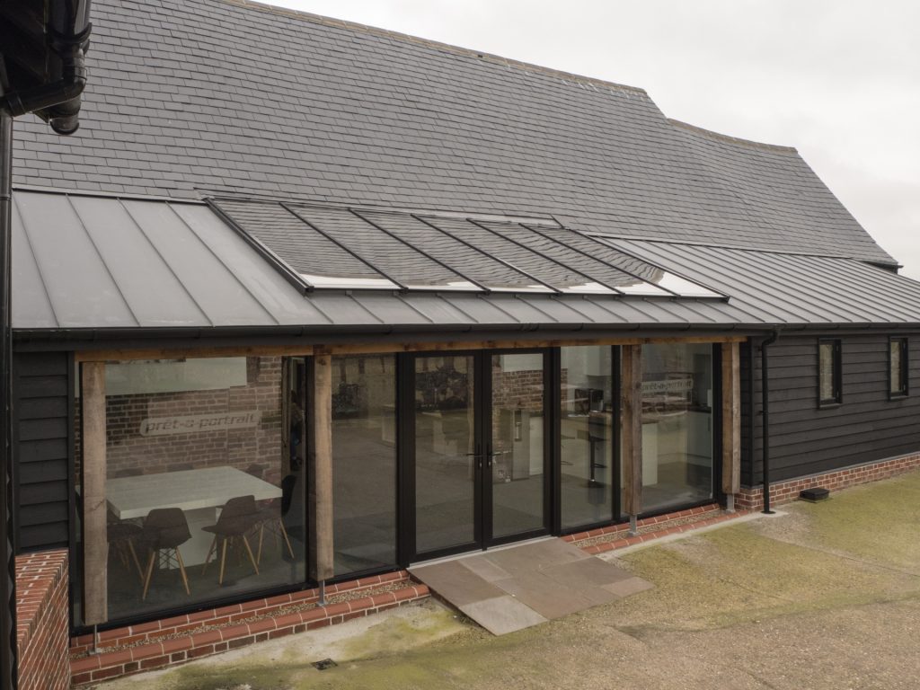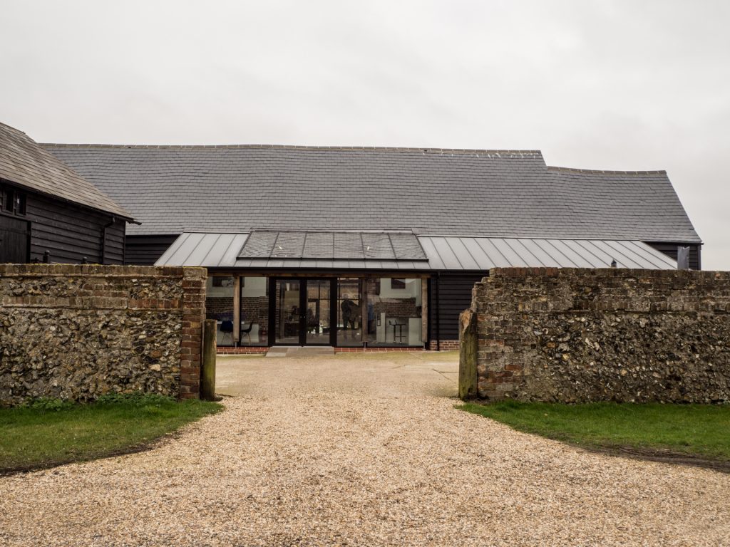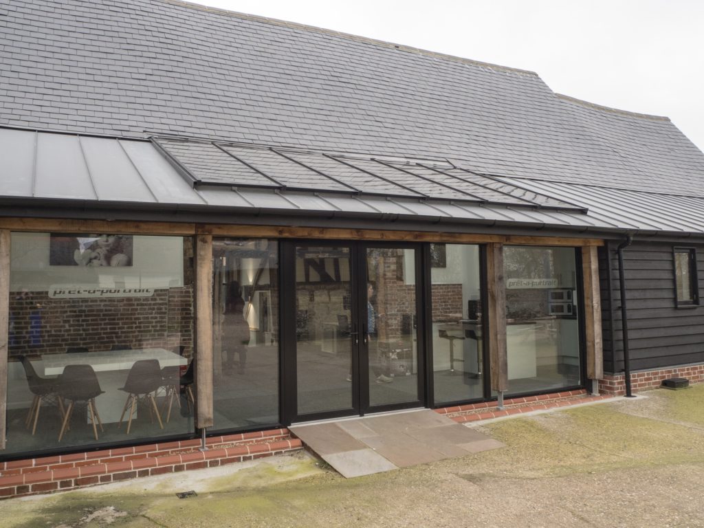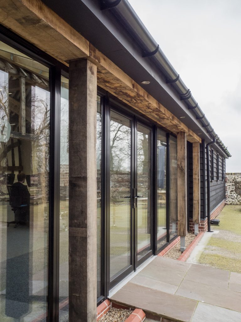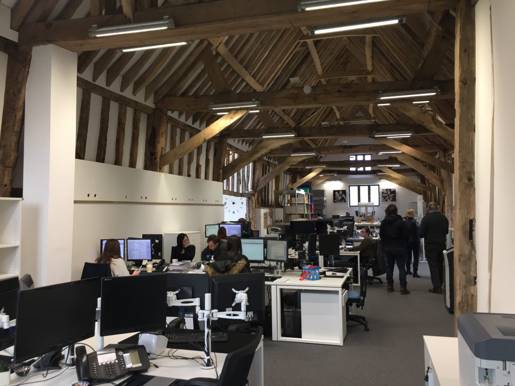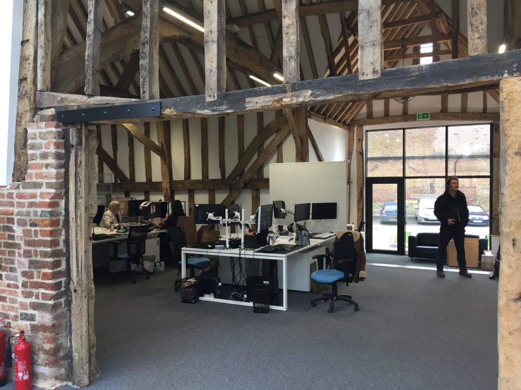 The barn was completely re-roofed with large sections of asbestos sheet roofing replaced with slate. To retain the original barn openings large glass screens were incorporated, letting light into the workspaces and also retaining the external aesthetic of the barn. Existing lean to-s were in a poor state of repair and these were either demolished and rebuilt or repaired  These now house new meeting rooms and the service areas, including the staff break out areas, kitchenette and WCs.  The rear  service wing lean to  has a zinc roof and large roof light to add a contemporary agricultural twist to the overall design.  A benefit of the lean-to housing these space is that it has allowed the main barn to be kept as a single open plan space, retaining the proportions of the original. Both the walls and roof have been insulated externally which has allowed the timber frame to be preserved internally creating a stunning interior, for which a bespoke lighting design has been produced.