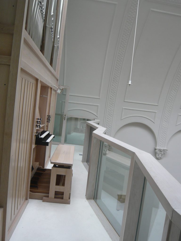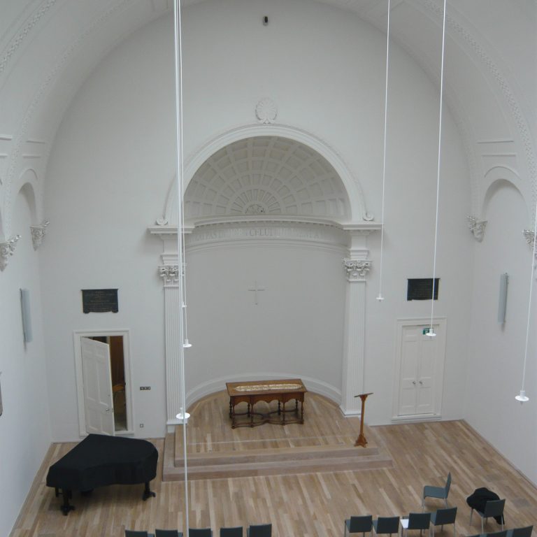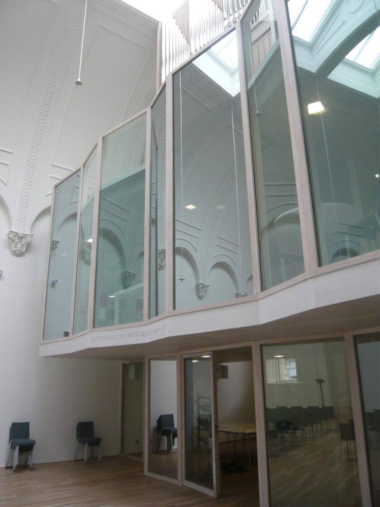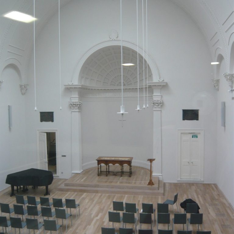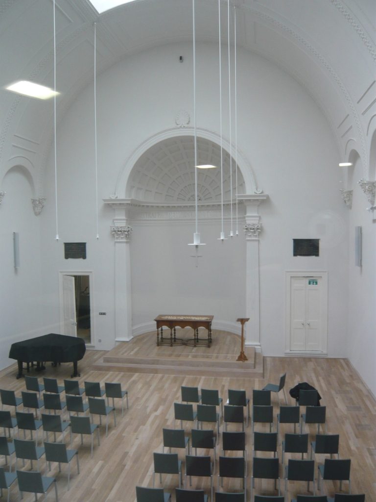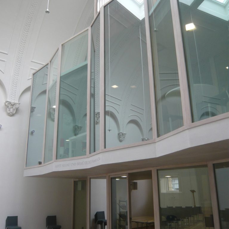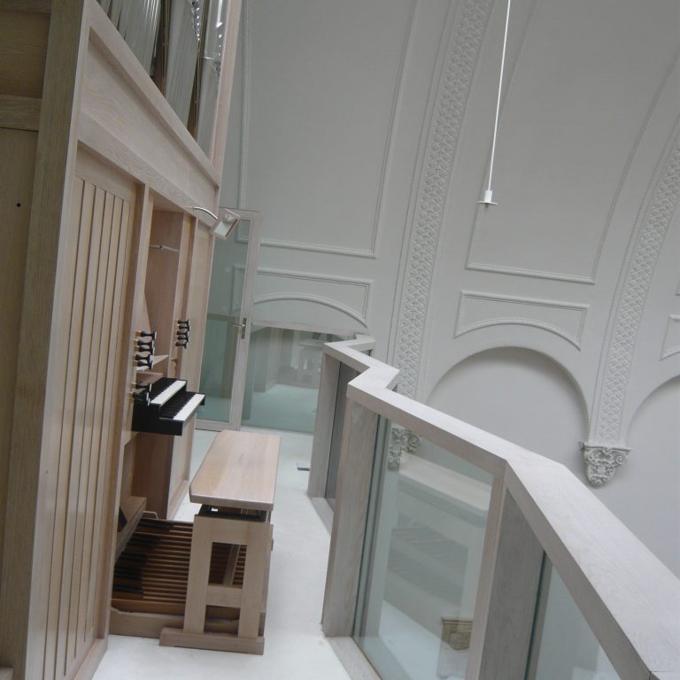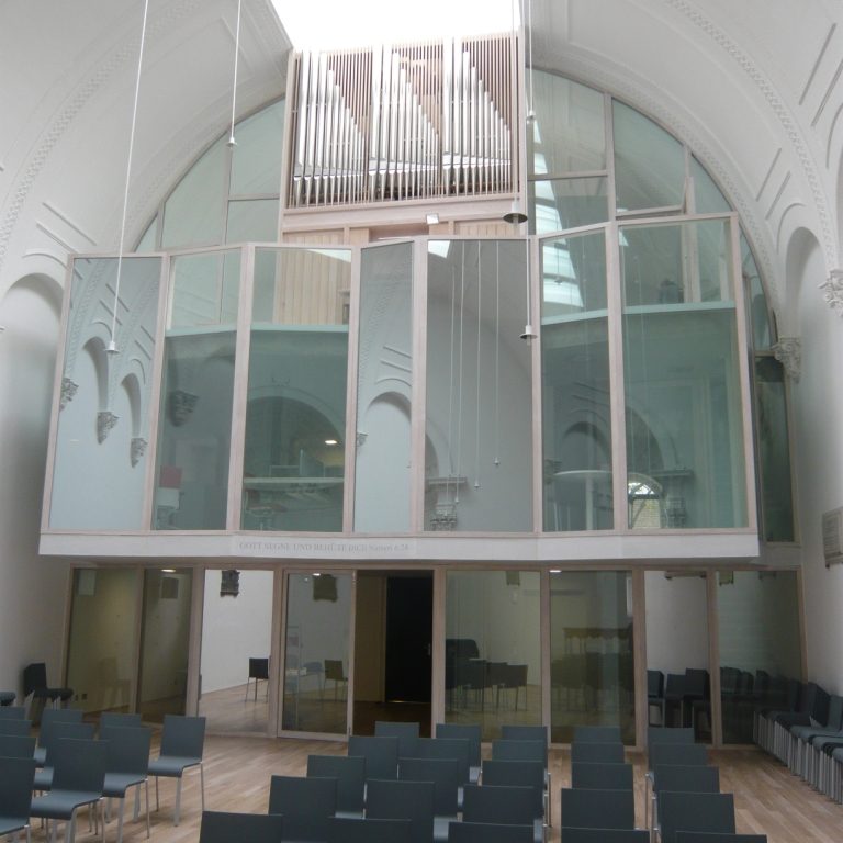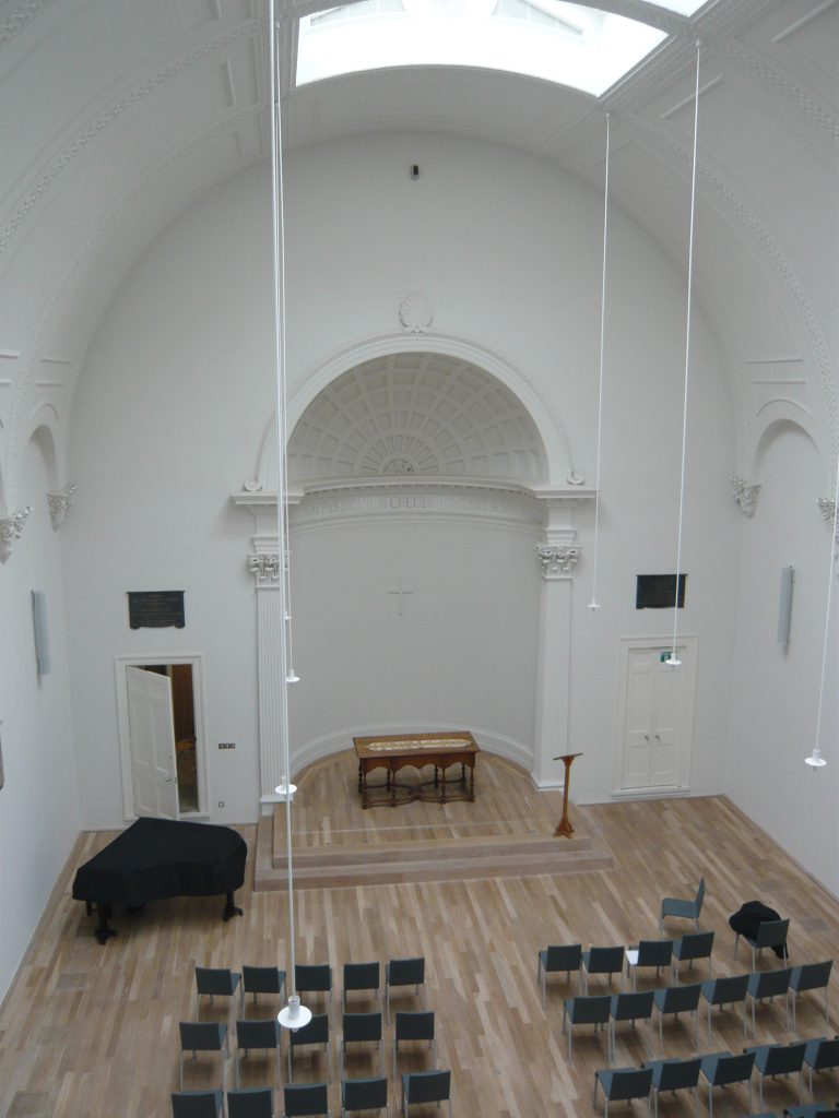 The original historic structure and features of the building have been retained and incorporated into the formation of a striking new insertion providing small meeting room spaces and balconies at the east end and a new organ loft.