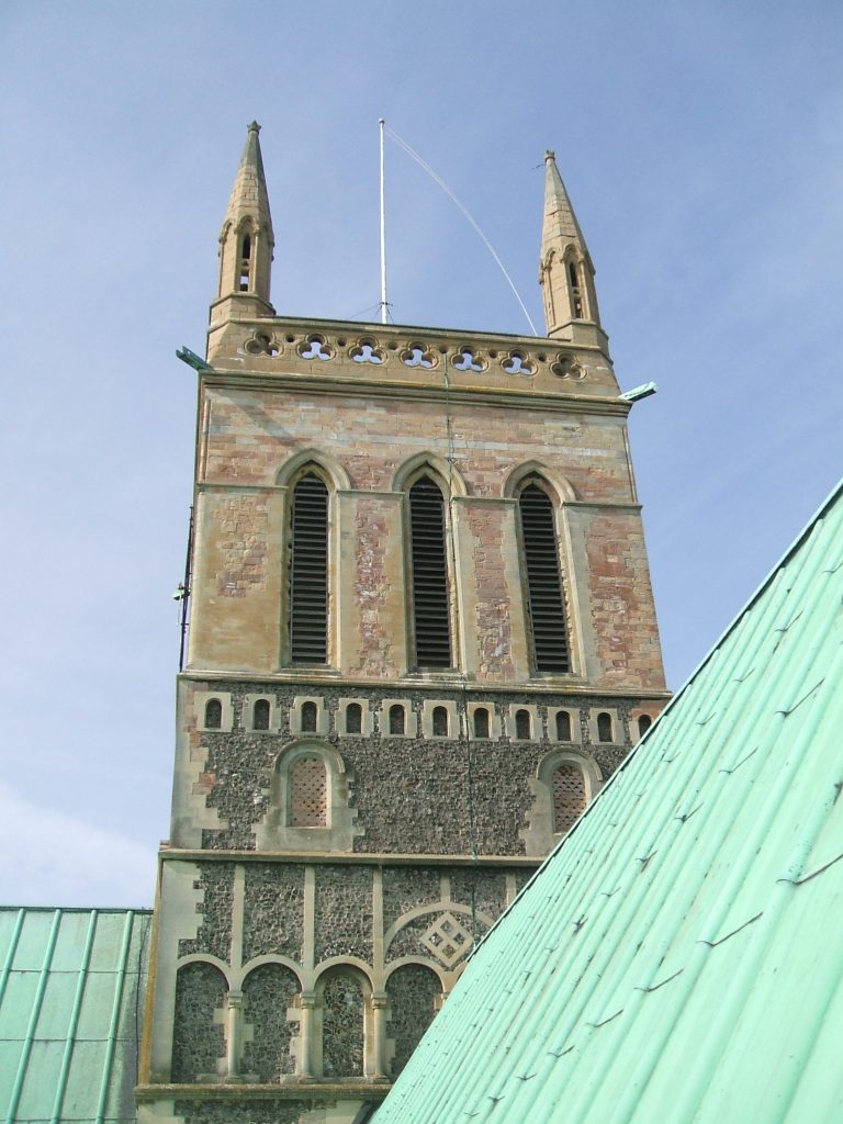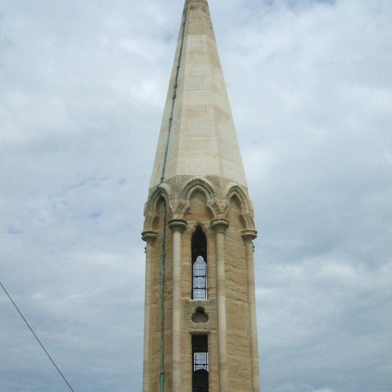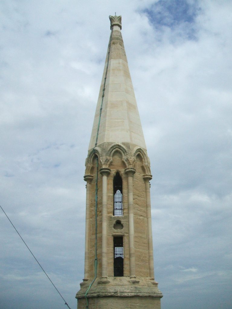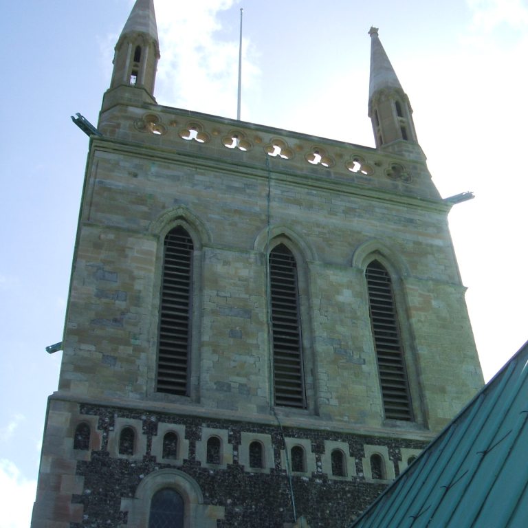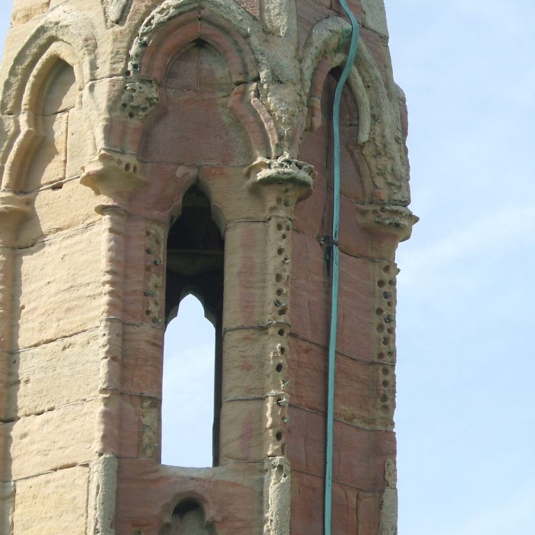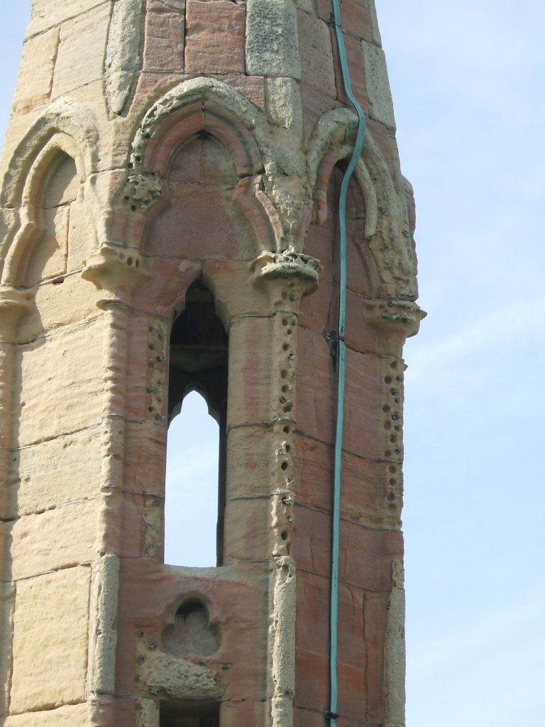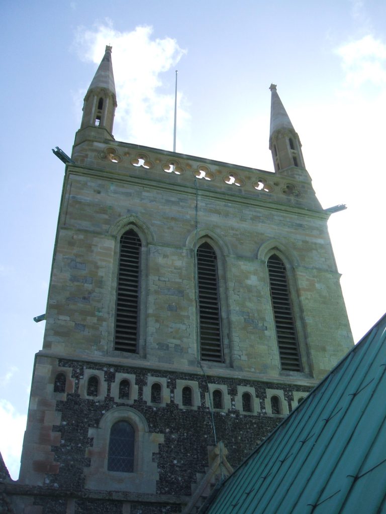 The central tower was restored in 1863. The pinnacles and parapets were built and the walls re-faced. Iron bands and needles were built into the walls to secure the bell frame and the spire.