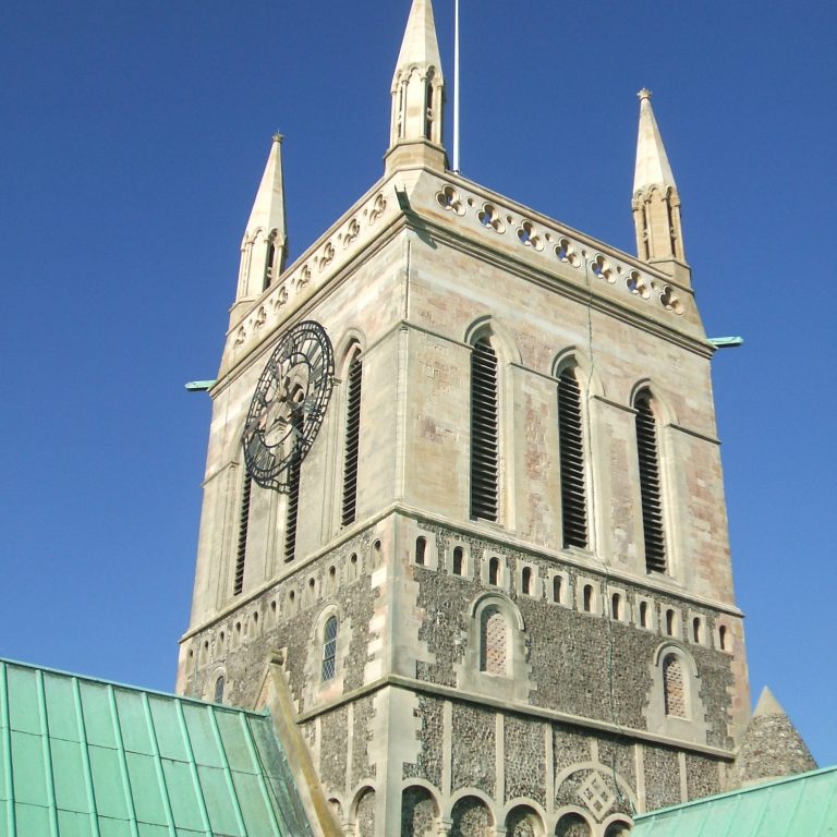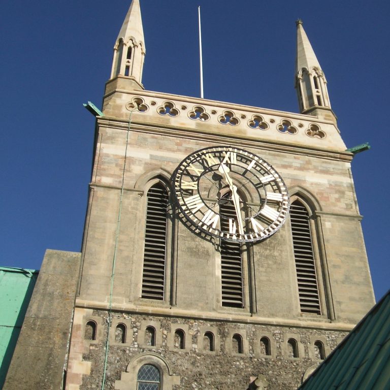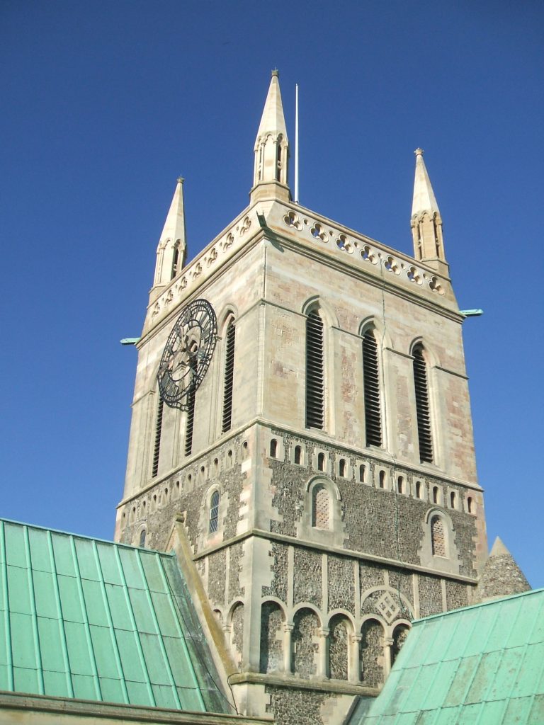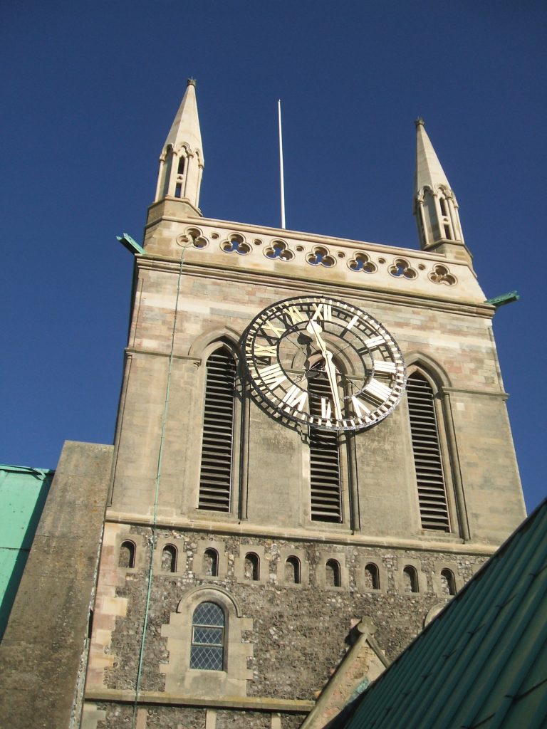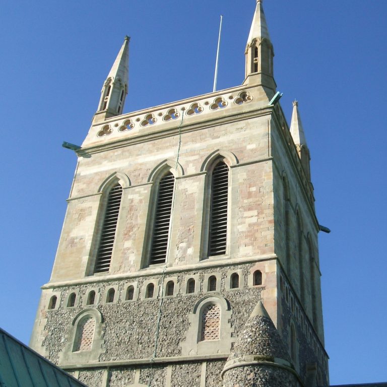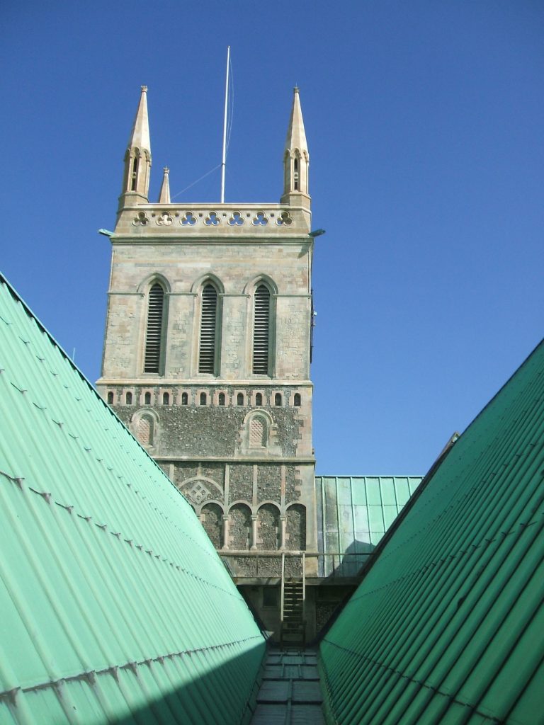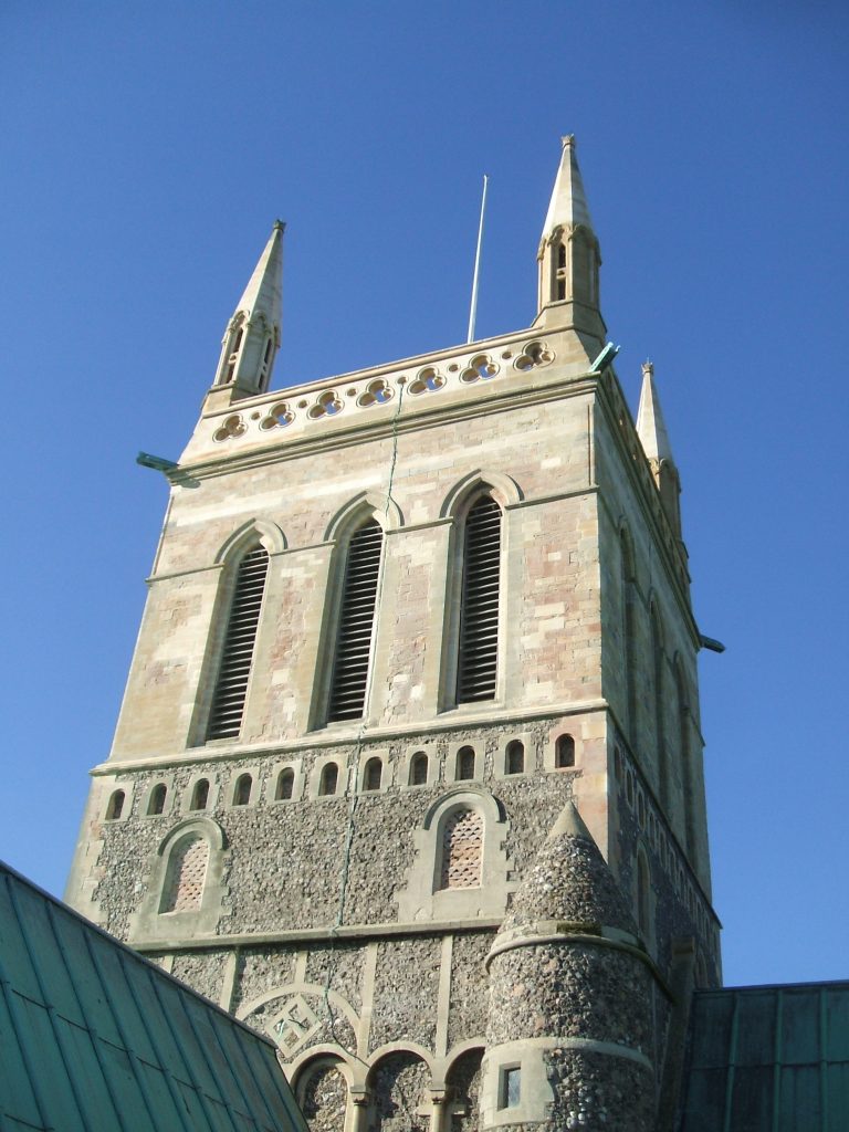 The central tower was restored in 1863. The pinnacles and parapets were built and the walls re-faced. Iron bands and needles were built into the walls to secure the bell frame and the spire.