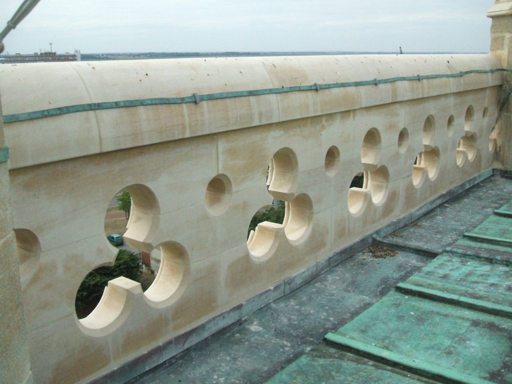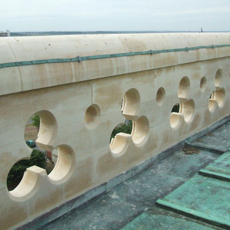 The repairs used lime mortars and grouts throughout, with new stonework matching the existing. Stainless steel was used for cramps and dowels between the stones and stainless steel restraining rods were built into the pinnacle spirelets.