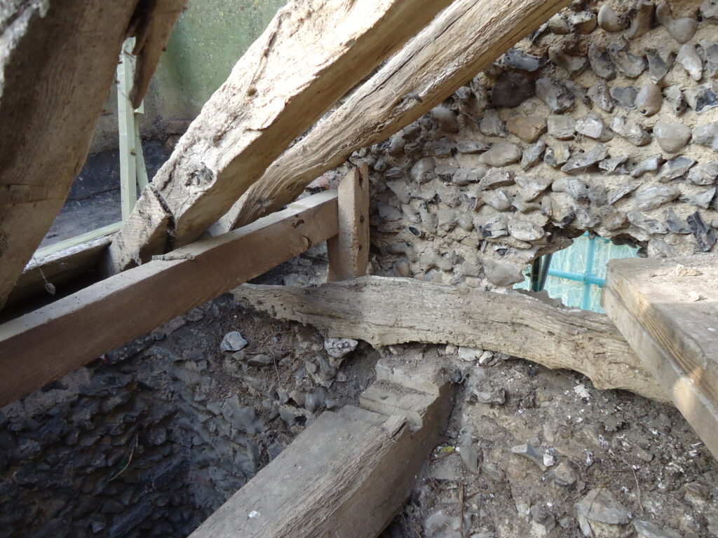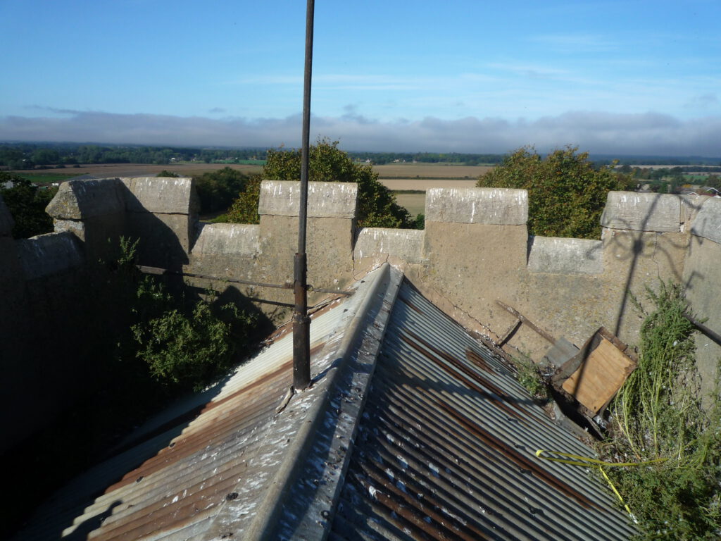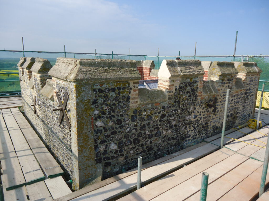 The Quinquennial inspection of 2010 identified the next pressing issue that had to be addressed was the tower, which for some time had exhibited cracking in the corner buttresses, failing quoins, drip course stones and facing flint-work all at high level much of the damage to the tower faces and buttresses had been caused by long term erosion of the mortar. The corrugated iron covering to the tower roof had perished and the stone and brickwork to the tower parapet was also in a poor condition. All the defects were classed as major priority issues.