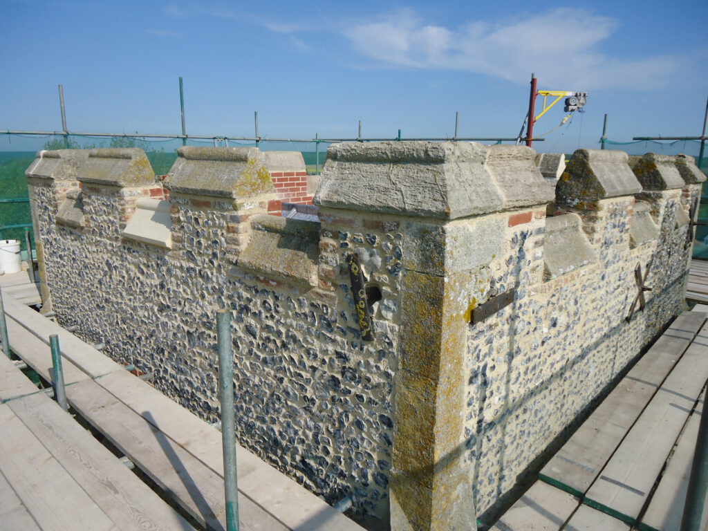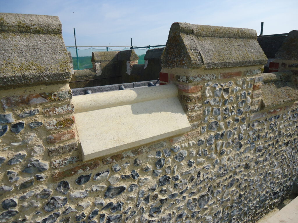 As the project progressed it was discovered that the condition of South and East parapet walls was far worse than anticipated so they had to be dismantled and reconstructed using all the salvaged flint and stone.