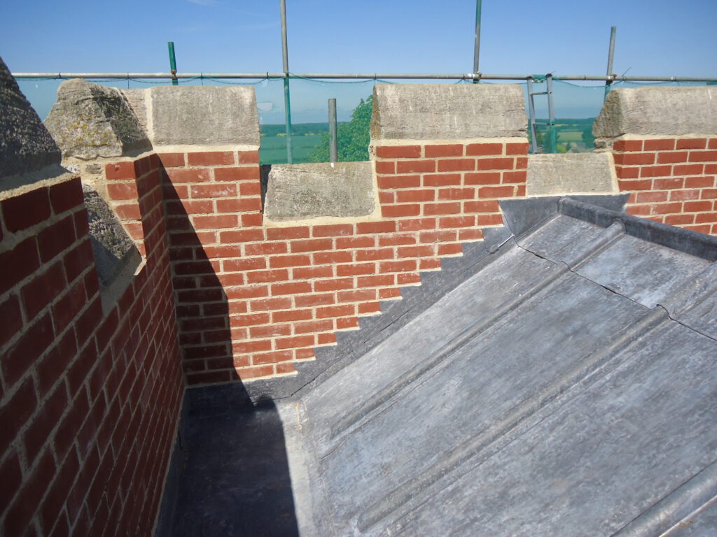 Works were finally commenced in February 2013 and were completed in June and included replacement of the corrugated iron roof covering of the pitched roof to the tower with a Code 7 cast lead sheet finish, laid on new timber boarding; the two rotten parapet gutters were replaced and the linings renewed and defective lead chutes renewed; replacement of damaged parapet and drip course stonework; merlon brick work; major re-pointing to all the elevations of the tower walling and buttresses; rebuilding of the failing flint face work around the North and South gargoyle chutes and stitching of cracks in the buttresses
