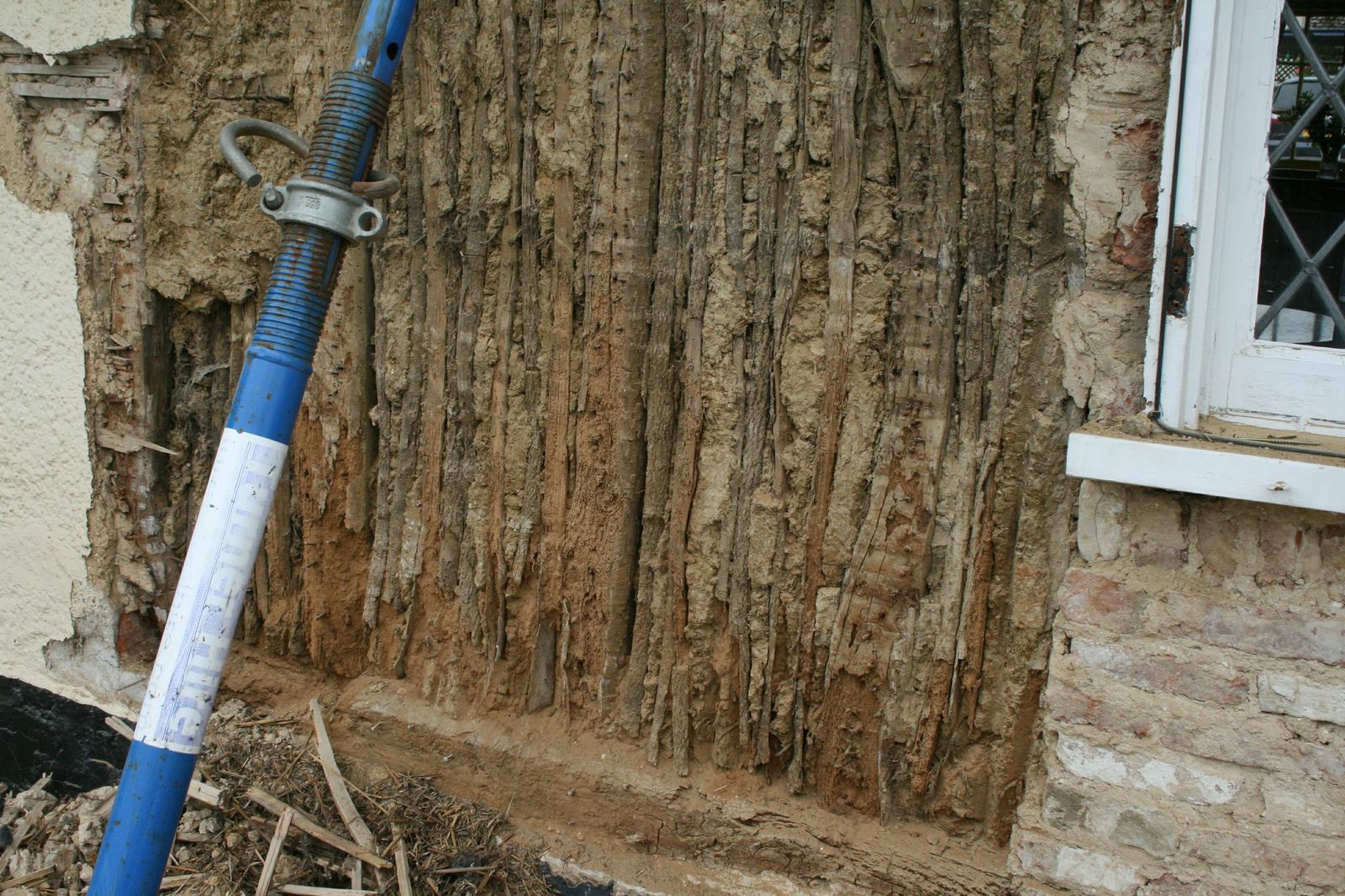 The pub is a Grade II* listed building – timber framed (with brick gable) under thatch. Years of water ingress has resulted in an widespread cases of Death watch Beetle infestation. The render was truly ‘structural’ – as was discovered when it was removed! The pub is in the progress of being repaired, including a new green oak frame in the pub garden. While work progresses the pub remains operational.